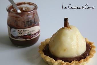 2. Dans chaque tartelette, verser 1/2 pot de "Délice chocolat" puis disposer une poire épluchée.