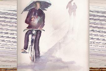 Mon aquarelle fait en atelier dessin. Un homme en vélo qui roule sous la pluie. ce dessin était un dur à cuire pour le faire.