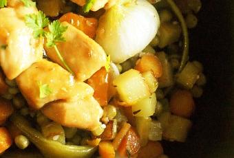Faire revenir les légumes avec un filet d’huile d’olive dans une casserole (si vous avec des petits pois en boite ne les ajoutez pas maintenant)