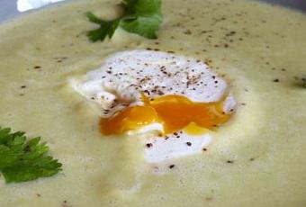 Votre velouté en fin prêt et chaud. Les oeufs pochés sont cuits.