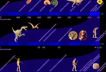 Plus nous avançons dans le temps, plus l'évolution s'accélère, rendant nécessaire de zoomer dans l'échelle du temps. L'extrémité droite de la ligne est donc agrandie successivement, pour arriver à l'apparition de l'homme, dont la civilisation existe depuis 6000 ans, soit 0,00004% de l'histoire de l'univers.
