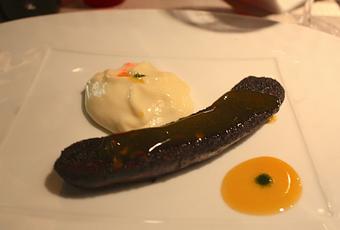 Un plat rustique et sophistiqué à la fois. Un boudin fait maison à la perfection, cuit légèrement croustillant, un boudin « unique au monde » comme l’affirme le chef Christian Le Squer et il n’a pas tort. Une classique mais néanmoins aérienne purée de pommes de terre, goûteuse, parfaite dans sa texture, et cet étonnant jus de fruit passion qui vient en décalage apporter sa touche délicatement sucrée et légèrement acidulée. Une alliance improbable à priori mais soudain évidente. Un petit chef d’oeuvre de plat à déguster en ce moment et dans le menu du déjeuner uniquement au restaurant Etc…