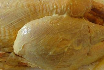 Salez, ajouter des grains de poivre noir à l'intérieur du poulet et glissez-y quelques branches de thym. Badigeonnez-le de moutarde. Mettez-le dans un grand plat enduit d'huile d'olive.