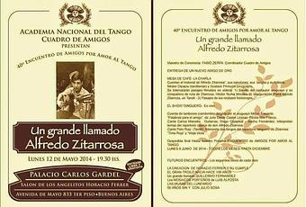 Le cercle des Amis de la Academia Nacional del Tango fêtera sa quarantième rencontre lundi 12 mai 2014. Pour l'occasion, l'entrée est libre et gratuite et toute la soirée tournera autour du grand auteur-compositeur uruguayen, Alfredo Zítarrosa (1936-1989), qui a profondément marqué l'esthétique de la chanson sur les deux rives du Río de la Plata. L'un de ses plus grands succès : El violin de Becho On frôle le sublime.Conférence partagée argentino-uruguayenne, projection cinématographique et concert exclusif au programme.
