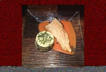 Cette recette Filet de Truite sauce au Poivron et vin blanc / Flan aux fanes de Radis provient du site Cuisine Blog.