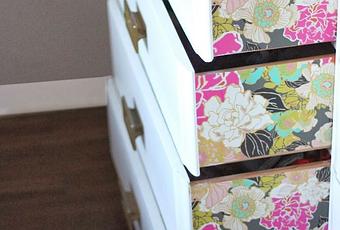 Première option, on transforme ce qui est généralement camouflé : les tiroirs. À l’aide de joli papier-peint, de papier scrapbooking, de journaux ou de photos + de la colle (Mod Podge ou en aérosol), on recouvre les côtés des tiroirs et l’intérieur, si l’envie nous le dit. En plus, transformer le fond des tiroirs fait un peu vintage. Mmm, on aime le vintage ! Et le résultat de tout ça ? Une belle surprise chaque fois qu’on voudra prendre une paire de bas ou un pyjama dans notre commode !