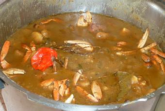 Ce fruit à pain et crabe avec chicketail de morue arrosé d'une côte de Blaye qui se déguste à la cuillère et en fait réservé à ceux et celles qui savent sucer les crabes, casser et aspirer le nannan des pattes, briser les mordants et récupérer la chair avec une pointe de couteau, croquer le crabe lui même en alternant avec une cuillerée de la soupe agrémenté de quelques morceaux de morue.