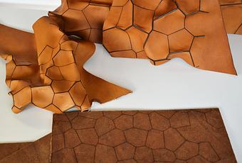 « Cuir de caractère est une combinaison de procédés sériels et de savoir faire manuel pour faire ressortir l’aspect unique de chaque peau. Le résultat se présente sous la forme de nouveaux états de matière : bas relief, volume organique, cartographie, paysage et presque dentelle de cuir, destinés à la décoration intérieure, au design de produit, de mobilier ou encore de mode.