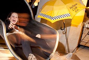 - Ma séquence préférée, "le coin de l'absurde" : elle réunit, vous l'avez compris, les inventions les plus folles et délirantes ! Parmi elles : le parapluie taxi pour ceux qui oublient toujours comme moi cet accessoire les jours de pluie, les chaussettes immatriculées pour trier plus vite son linge, l'assiette-miroir pour tromper notre estomac sur la quantité avalée, le balai-micro pour faire son show pendant la corvée ménagère, des coussins télécommande pour éviter de la chercher partout, des plantes en pot se déplaçant seules pour chercher le soleil... Cartels et mini-vidéos sur écrans LCD interprètent les objets exposés et livrent leur secrets de fonctionnement.