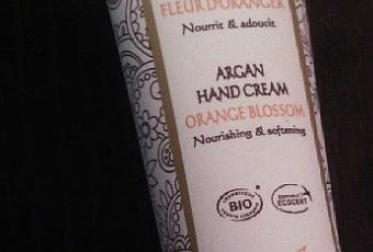 C’est le cas de celle que j’utilise actuellement, une crème mains à l’argan, nourrissante et adoucissante, à la fleur d’oranger, de la marque Argandia.