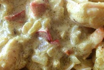 Faire chauffer l'huile et faire revenir l'oignon. Ajouté le poivron rouge detaillé en cube. Ajouter les scampis, laisser colorer puis ajouter : la pate de curry, les piments ciselés, le jus de citron, salé, poivré et ajouter le lait de coco, laisser cuire et servir soit avec du riz ou des tagliatelles comme ici.