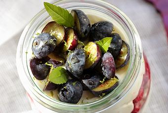 Mettez à ramollir la gélatine dans de l'eau froide . Versez le fromage blanc et le yaourt dans un saladier , fouettez le avec le zeste d'un citron et le sucre glace . Essorez la gélatine , mettez dans un petit bol avec 2 cuil à soupe de crème fraîche , faites chauffer au micro ondes (environ 20 secondes à 800 w) pour faire fondre la gélatine . Versez ce mélange chaud dans le saladier contenant le fromage blanc , mélangez rapidement pour l'incorporer . Montez le reste de la crème en chantilly , incorporez la délicatement au fromage blanc .Versez ce mélange dans un saladier , filmez et laissez au frais minimum 4 heures . Pour monter les verrines je vous conseille d'utiliser une poche à douille (sans douille ) pour les remplir plus facilement et plus proprement . Réalisez une couche de fromage blanc mousseux , disposez des framboises coupées en 2 , recouvrez de mousse . Découpez des myrtilles que vous placerez sur le dessus . Ajoutez un filet de miel , des feuilles de verveine fraîche et éventuellement un zeste de citron vert .