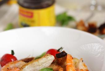 Détailler les tranches de pain en petits cubes puis les faire dorer dans une autre petite poêle avec de l'huile d'olive. Egoutter sur un papier absorbant. Disposer un peu de tapenade sur les cubes de pain dorés (pour ceux qui n'aiment pas la tapenade, laisser les cubes de pain nature). Dans la même poêle, faire rapidement dorer les crevettes roses et grises. Débarrasser et placer les tomates cerise. Remuer la poêle fréquemment pour les faire cuire sur toutes les faces rapidement sans les éclater.