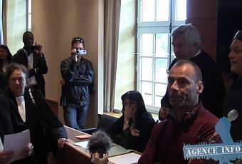 Il est accompagné de quelques supporteurs, et même Dieudonné un peu plus tard dans la video, pour crier "faussaire ! Faussaire!" à l'encontre des avocats qui passaient devant.