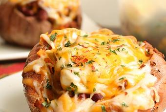 Préchauffer le four à 450°F. Placer une feuille de papier aluminium sur la grille du bas du four.À l'aide d'une fourchette, piquer les patates douces sur toute leur surface. Enfourner sur la grille du milieu. Laisser cuire pendant 45 minutes. Retirer du four, placer sur une plaque à pâtisserie recouverte de papier aluminium et laisser tiédir environ 10 minutes.Pendant ce temps, préparer le chili: Faire revenir le steak dans l'huile, à feu moyen pendant environ 5 minutes. Ajouter, les oignons, l'ail, la poudre de chili et faire revenir pendant 3 à 5 minutes.Incorporer la pâte de tomate, les tomates, le poivron, le piment de cayenne, la cassonade et le cumin et le bouillon de boeuf. Porter à ébullition, couvrir et laisser cuire 1 heure à feu moyen-doux, en vérifiant de temps à autre que le mélange reste humide (rajouter un peu d'eau ou de bouillon au besoin). Ajouter les haricots, mélanger et poursuivre la cuisson environ 10 minutes. Saler et poivrer au goût.Faire une incision centrée sur toute la longueur de chaque patate douce. Écarter délicatement et creuser la chair à l'aide d'une cuillère (personnellement, je n'ai pas retiré de chair). Répartir le chili dans les 4 patates douces. Garnir de fromage râpé et saupoudrer de coriandre fraîche.Enfourner pendant 5-8 minutes où juste assez pour que le fromage ait fondu.Servir chaud, accompagné d'une salade.Sources : www.allrecipes.com www.gourmandeinthekitchen.com