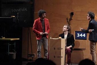 Comment donner de la matérialité à la pensée, au fait de penser ? « Comment ça marche dans la tête quand…? » Telle est la question posée tout en haut du décor, une sorte de palissade en bois sur laquelle vont apparaître des propositions : « on pense », « on doute », « on a une idée », « on croit », etc. Il y a du jeu, il y a des choses qui appuient les paroles, des choses posées, des choses portées, des choses qui roulent, même si tout ne marche pas toujours, si certaines images proposées sont très banales (la chaise pour réfléchir, encadrée de miroirs, par exemple). L’explication des concepts en décomposant les mots, ça va bien une fois, mais le souvenir qui vient du dessous ne m’a guère convaincu. C’est encombré un peu dans la tête, sur la scène. Mais le piano qui dialogue avec un autre piano invisible puisqu’il est enregistré, qu’est-ce que ça provoque dans la tête ? Mais l’oscillation inscrite au tableau noir pour exprimer le doute, au-dessus du piano, n’est-ce pas un métronome ? Mais l’heure du thé (ou du café), son anticipation, sa réalisation, l’expansion du présent, ça laisse des traces dans l’esprit des spectateurs.