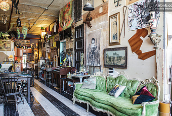 galerie d'art, une boutique ou encore un musée d'antiquité, ce loft d'artiste ne comporte pas moins de deux étage, six chambres et une salle de séjour gigantesque... Un peu partout les choses (parfois insolites lol) s'accumulent : deux canapés anciens (je suis super fan du canapé vert au passage!), une balançoire, une ancienne chaise de coiffeur, une machine à coudre industrielle... Et j'en passe ! Il y en vraiment partout, c'est quand même beaucoup pour moi, mais je ne suis pas loin du coup de coeur pour ces associations incongrues qui créent une âme unique à ce lieu ! Ah New York est vraiment la ville où tout est permis !