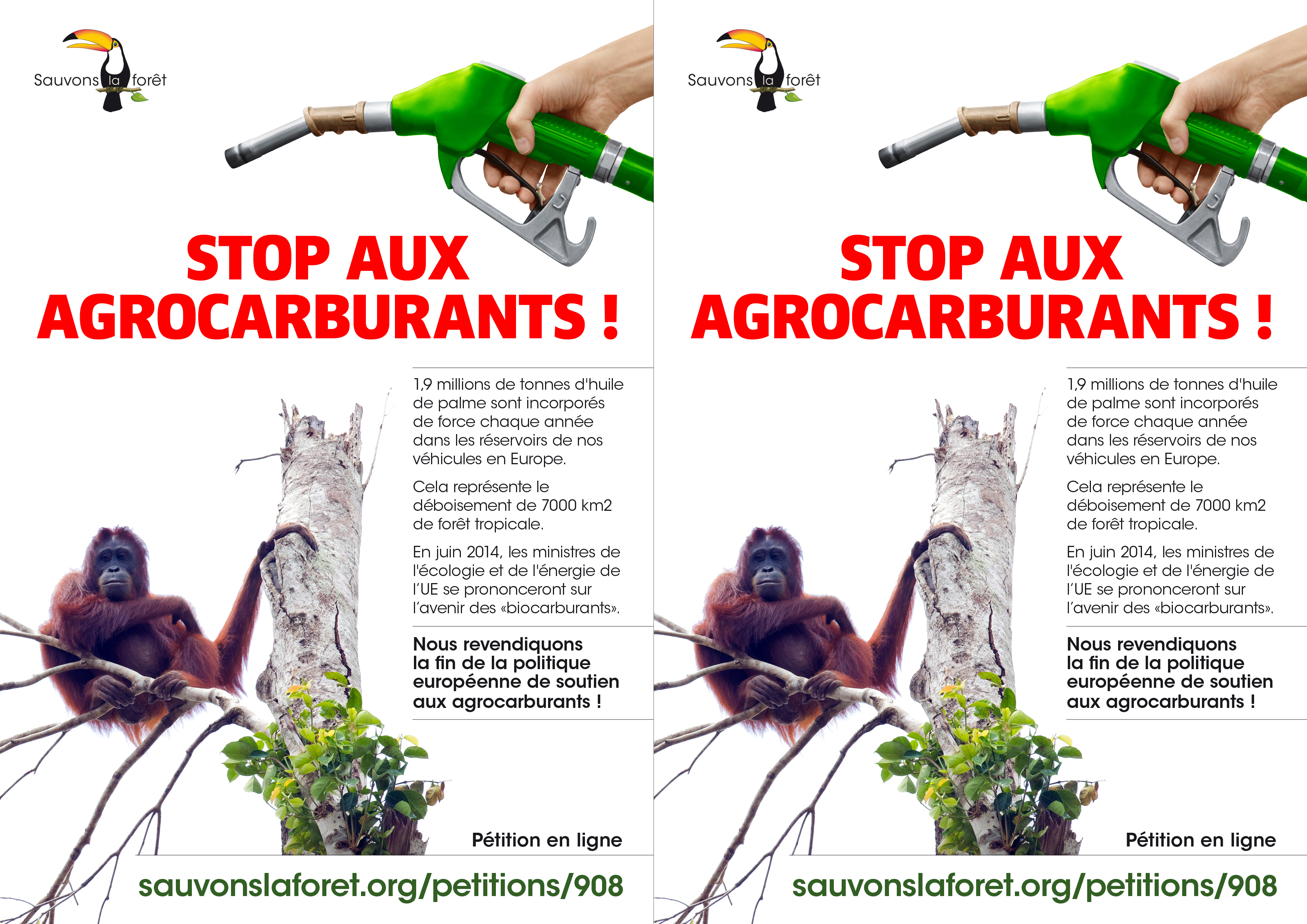 L'UE va de nouveau débattre sur sa politique de soutien aux agrocarburants Chers ami(e)s de la forêt tropicale,Plus de 140.000 personnes se sont déjà mobilisées aux côtés de Sauvons la forêt pour demander à l'Union européenne d'abandonner sa politique pro-agrocarburants et ses effets dévastateurs sur les forêts tropicales d'Indonésie et de Malaisie.Notre prochaine occasion d'agir est le vendredi 23 mai 2014 : le Comité des représentants des gouvernements des Etats membres de lʼUE (COREPER) se réunira une nouvelle fois afin de formuler les recommandations qui devraient être votées par les Ministres de l'environnement et de l'énergie de l’UE les 12 et 13 juin.Faisons entendre notre voix : nous voulons la fin immédiate des mesures d’incorporation obligatoire, de l’exonération fiscale, des subventions et de l’importation des agrocarburants !
