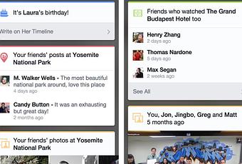 Dans leur forme actuelle, ces cartes possèdent un code de couleur. Ainsi, les anniversaires sont en bleu, les contenus sont en vert, les photos en jaunes et les lieux en rouge. Ces cartes contextuelles devraient selon Facebook favoriser la découverte et pousser les utilisateurs à partager plus souvent ce type de contenu.
