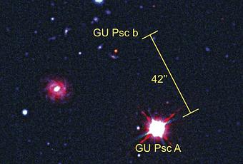 Emmenée par Marie-Ève Naud, étudiante québécoise préparant un doctorat de physique à l’Université de Montréal, une équipe internationale d’astrophysiciens a attrapé dans ses filets une exoplanète massive distante de 2 000 unités astronomiques (soit 300 milliards de km !) de son étoile. Sa période orbitale dépasse de loin toutes celles établies pour d’autres mondes (équivalents) connus, système solaire inclus : 80 000 ans ! Désignée GU Psc b, elle apparait distinctement sur les images collectées dans différentes longueurs d’onde, principalement le rayonnement infrarouge, par les caméras installées au foyer des télescopes de l’Observatoire Gemini-Nord, de l’Observatoire du Mont-Mégantic (Canada), du Canadian French Hawaian Telescope (CFHT) et du Keck Observatory (Mauna Kea à Hawaï). Vu dans un télescope, l’espace entre les deux astres équivaut à la taille angulaire de Saturne. « GU Psc b est un véritable cadeau de la nature » raconte Marie-Ève Naud. « La grande distance qui le sépare de son étoile offre de l’étudier en profondeur avec une variété d’instruments et permet une meilleure compréhension des exoplanètes géantes en général ».
