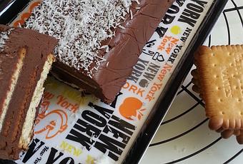 Versez une couche de ganache, une couche de petit beurre et ainsi de suite en terminant par la ganache.