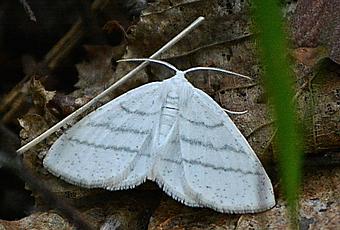 Les ailes postérieures sont également blanches satinées mais avec seulement 2 traits parallèles transversaux gris.
