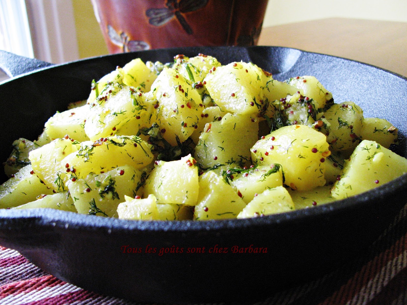 - 4-5 pommes de terre moyennes, coupées en cubes de 2cm (environ ¾ de pouce)- 3 gousses d'ail, finement hachées- ¼ de c. à thé (cc) de curcuma- 1 c. à thé (cc) de graines de moutarde noires- ½ c. à thé (cc) de flocons de piments forts- Un petit bouquet d'aneth (une dizaine de branches)- 2-3 c. à soupe d'huile végétale- Sel