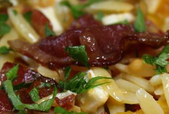 Laissons ensuite refroidir, puis mélangeons la totalité des ingrédients (pâtes, poivrons et coppa) ajoutons la fêta coupés en morceau puis quelques gouttes (à votre convenance) d’émulsion de poivrons, romarin et ail. Mélangeons le tout. Assaisonnons.
