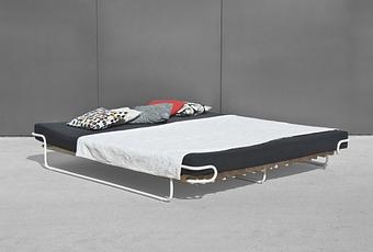 « A tubular steel base and a slatted frame of birch plywood form together a solid but also graceful object. The material ensures the static, but creates also by its elastic effect the necessary comfort. It reaches with low material consumption maximum space. To allow a simple transport, the bed can be easely divide into its several components.«