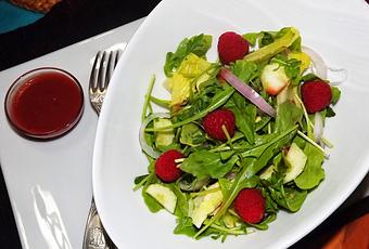 Peler le concombre et le couper en petits dés. Laver et essorer toutes les feuilles de salades. Préparer la vinaigrette: écraser à la fourchette 4 ou 5 framboises, ajouter la moutarde , l'huile, le vinaigre le miel et mélanger jusqu’à obtenir une belle émulation ajouter un peu de poivre et u sel selon les goûts. la vinaigrette devrais avoir une belle couleur bordeaux. Dresser la salade dans un bol parsemer du reste des framboise et servir avec vinaigrette a coté.