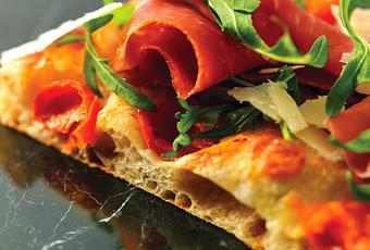 Pizza San Daniele (Jambon San Daniele affiné 18 mois, tomates cerises de Pachino, roquette, parmiggiano di Reggiano)
