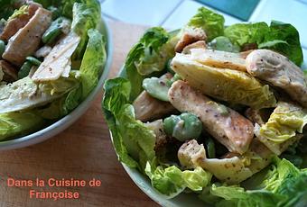Ce week-end magnifique, m'a donné envie de Salade verte et de Poulet grillé, j'ai fait comme une Salade de Poulet, presque façon César, je dis presque parce que je n'ai pas utilisé d'anchois et de câpres. Et comme je suis dans ma période : Fèves fraîches, c'est le début de saison et donc le moment d'en profiter pleinement et jusqu'au mois de Juillet. Cette légumineuse est considérée comme un féculent, riche en fibres glucides et protéines. Elle est cultivée depuis le néolithique, au Moyen Age elle était autant consommée que la pomme de terre dans les années 50. N'hésitez pas à la consommer, seule ou mélangée dans des salades composées. Il suffit de l'écosser puis peler la fève une fois cuite. Cette salade peut être préparée à l'avance et dans ce cas ajouter la sauce 20 minutes avant de servir.