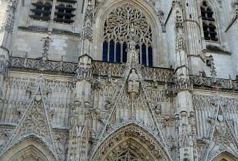 Dentelle de pierre éblouissante, élégants gâbles, tambours aux lignes élancées, statuaire préservée en très grande partie, on remarque plus particulièrement sur la façade l’évocation de Marie Salomé accompagnée de ses deux fils : Jacques le Majeur et Jean l’évangéliste. Malheureusement, l’église est fermée le matin et nous n’avons pas pu en admirer l’intérieur, et en particulier les vitraux de William Einstein, artiste de l’Ecole de Paris.