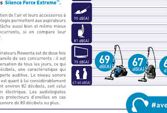 Le niveau sonore des aspirateurs Rowenta est beaucoup inférieur à celui des appareils de ses concurrents, il est réduit à celui d’une conversation de tous les jours.