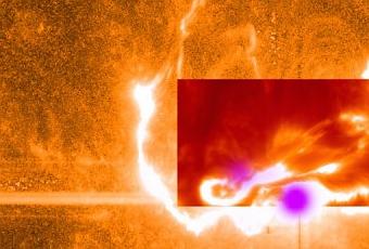Image composite de la région active 2017, le 29 mars à 17H46 TU – à l’arrière-plan, on distingue les granules de la photosphère photographiés par SDO ; au second plan, on aperçoit les filaments révélés par IRIS ; au premier plan, on peut voir la circulation de l’énergie et les traces mauves superposées marquent les rayonnement x les plus intenses