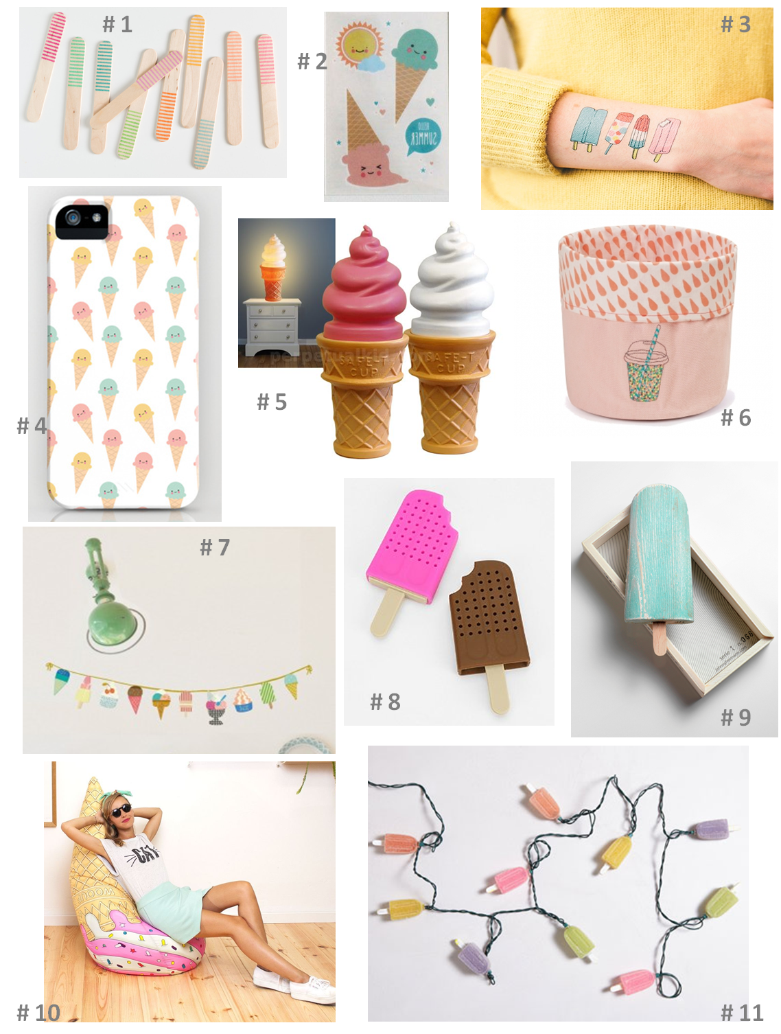 #2 Tatoo éphémere chez Le Petit Biscuit Shop #3 Tatoo éphémere Tattly #4 Coque Iphone chez Le Petit Biscuit Shop #5 Lampe Ice Cream #6 Panier Granité Mimilou #7 Stickers Glaçe Mimilou #8 Infuseur thé chez Urban Outfitters #9 Objet déco Glaçe en bois Johnny Herman #10 Pouf Glaçe Woof #11 Guirlande Popsicle Le petit plus de ma sélection glacée... à croquer !