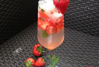 Dans votre verre, déposez les feuilles de menthe coupées en deux, les fraises coupées en lamelles (en réserver une pour la décoration), le sucre, le jus de citron.