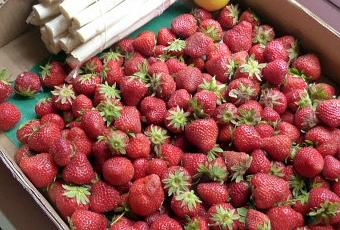 Ce matin, nous avons acheté des fraises pour cuire de la confiture. Ce sont des Darselect, idéales pour les confitures selon l'agriculteur qui les produit et vend en direct, avec des asperges aussi.