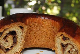 J’ai eu aussi l’idée de prêter la forme inhabituelle du « kringle estonien » à ma dernière brioche ; ceci a donné un très joli visuel, mais une moins bonne répartition de la farce (par ailleurs, je n’ai pas trouvé des informations sur ce fameux kringle, bien qu’il ait fait le tour des blogs ; au cas où il y a des Estoniens qui lisent ce billet, qu’ils n’hésitent surtout pas à éclairer ce mystère !).En fin de compte, notre version préférée a été aux raisins secs, aux noix concassés, au sucre roux et sans clou de girofle.