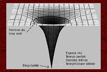 -« Voilà PIERRE ce qu’ une représentation d’artiste , trop vite expliquée, entraîne !.... Une idée fausse ! Quand tu regardes cette photo , bien sûr , tu t’imagines te faire engloutir par le trou et tu oublies complètement que les formes du volume de l’espace en soi ne bougent pas d’un micron autour du trou noir ! C’est la sur-structure de l’espace –temps qui s’impose qui est symboliquement représentée ainsi …. Et qui conduit à te sentir entraîner puis tomber dans le champ du trou noir comme dans une trappe profonde inévitable ……C’EST L’ESPACE- TEMPS QUI DEVIENT SI COURBE ET NON L’ESPACE EN LUI-MEME, ……