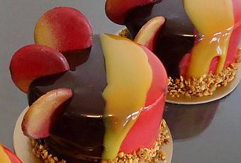 Les entremets sont composés d'une mousse au chocolat noir, d'un crémeux poire-cassis et d'une base croustillante en praliné noisettes et riz soufflé.