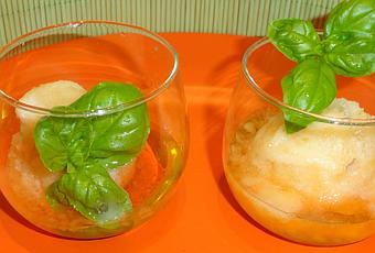 Dans deux petites coupes, disposez une boule de sorbet au melon, arrosez de 2 c à s de melonade et finir par un trait de sirop de basilic.