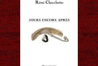C’est un livre d’un seul tenant, d’un seul enjeu : revivre. Il se place dans la suite du beau Puisement, même éditeur, 2010 ; les premiers vers indiquent cette continuité : « Jours encore après / une femme pendue à un fil à linge bleu /(…) que demeure-t-il de ces jours encore après ? » (p.11). Mais si la force motrice des deux livres est identique, son maniement en mots est différent : dans Puisement, il s’agit d’absorber le choc, dans Jours encore après, Checchetto interroge cet « encore » du titre. On pourrait dire que le livre repose sur cet adverbe doux-amer, « ce mot qui bat doucement », « six lettres qui suffisent à guérir et à rétablir tout l’alphabet » (p.12). « Encore » indique à la fois la persistance du passé et son dépassement en quelque sorte forcé par l’écoulement du temps. Un autre mot bref, « plus », peut jouer sur ce double registre et donner la mesure du fragile équilibre en train de s’établir « après ». « nous parlons d’elle plus là » (p.52) : on entend à la fois, selon la prononciation ou pas du « s », un davantage ou un nevermore.