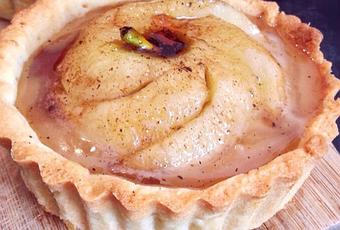 Pour le montage, disposez une couche de caramel sur les fonds de tarte et sur le dessus, une demi pomme pochée.