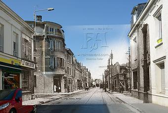 La rue de Cernay au moment de la Recontruction après la Première Guerre Mondiale. Cette longue voie va de l'avenue Jean-Jaurès, jusqu'à la sortie de Reims, en direction de Cernay-lès-Reims. La carte postale montre l'angle de cette rue avec la rue de Berru (autre village situé dans les environs de Cernay-lès-Reims).