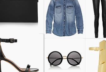 Chemise en jean, H&MPantalon, Saint LaurentSandales, GivenchyPochette, Victoria BeckhamLunettes, The RowBague, Eddie Borgo