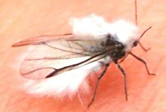 Corps jaune-vert couvert de cire blanche floconneuse.