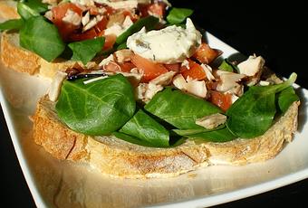 2) Tartiner chaque tranche de pain avec le fromage Soy ail et fines herbes, déposer quelques feuilles de mâche, puis recouvrir avec le poulet aux tomates. Assaisonner chaque tartine avec un filet de vinaigre balsamique. Pour finir déposer une petite c à c de crémeux Soy ail et fines herbes sur chaque tartine et déguster.