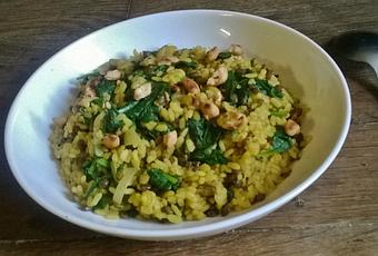 Dans la poêle sur feux moyen faites dorer l'ail et l'oignon dans l'huile d'olive. Ajouter le riz et faites le frire quelques instant ajouter les pois chiches et les raisins sec et verser le bouillon et le curry couvrir et porter à ébullition. Baisser à feux doux quand la totalité du liquide est absorber ajouter les épinard et remuez jusqu'à ce qu'ils réduisent saupoudrez de noix de cajou et servir bien chaud
