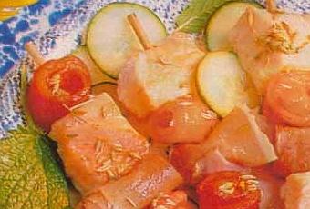 Retirez les morceaux de poissons de la marinade. Enfilez-les sur de petites brochettes en bois en les alternant avec des rouleaux de jambon cru et de poivron. Parsemez les brochettes avec le reste des graines de carvi.